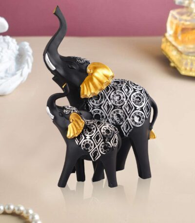 Polyresin Elephant Showpiece Statue and Artifacts for Home Decor, Living Room, Table Decoration for Gifting, Interiors and Diwali Decoration Black Golden (Set Of 2)